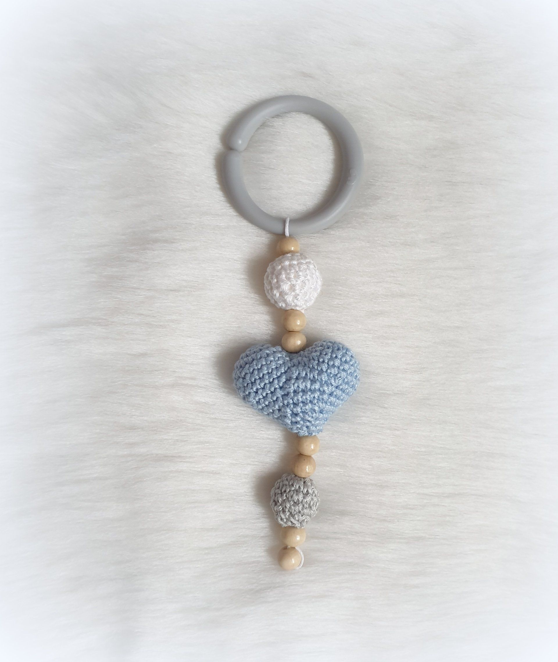 Süße gehäkelte Anhänger für den Kinderwagen. Zur Befestigung ist ein Schnullerkettenclip in natur angebracht, außerdem ist der Anhänger mit Holzperlen versehen und im inneren des Tierchens ist eine Rasselkugel. Alles wurde mit reinem Baumwollgarn gehäkelt und mit hochwertigem Hochbausch-Polyester gefüllt.